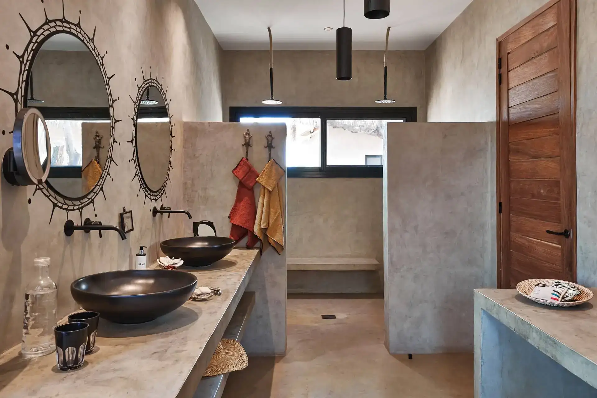 Les salles de bain sont équipées de double vasques, de double douches, d’une coiffeuse et d’un wc séparé.