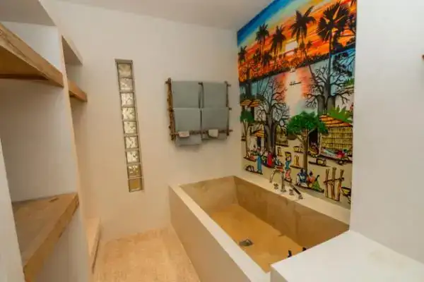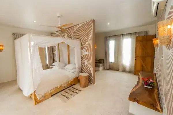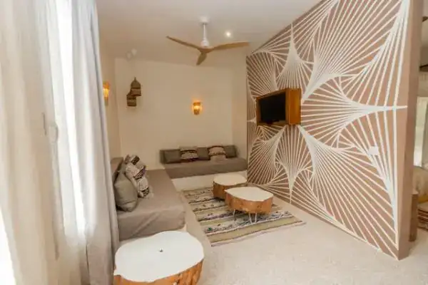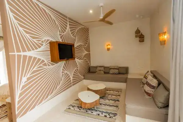 Elle se compose de deux chambres avec lit king-size et coin salon avec banquettes lits pouvant accueillir 2 enfants de max 12 ans, deux salles de bain avec douche, et wc séparé, ainsi qu’une chambre pour loger une nounou.